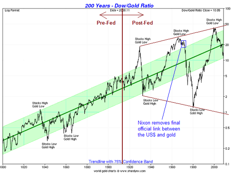 The U.S. dollar has lost about 98% of its purchasing power since 1913 due to inflation. Obviously, controlling inflation didn’t work very well, did it? And if you want to see how well they smoothed out the business cycle, look at the 200 year chart above. On the left of the center red line is the business cycle before the Federal Reserve. On the right is the business cycle after creating of the Fed.
