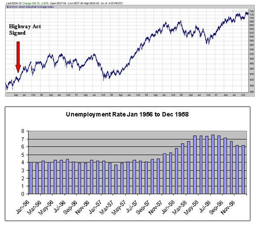 With Obama, that’s not going to happen. He’s going to repeat all the mistakes made by Roosevelt during the Depression of the 1930’s. Obama has already announced massive public spending programs including an infrastructure rebuild program that would rival the U.S. Interstate project started in 1956. Actually, this is a positive thing amidst all the doom and gloom. There is no doubt that the infrastructure (roads, bridges, ports, etc.) need major repairs. However, this should have been an ongoing program to prevent tragedies like the collapse of the bridge in Minneapolis and politicians are to blame for starving such programs. However, if anyone thinks it will solve the economic crisis, history proves otherwise. In the 1930’s FDR’s New Deal programs provided only temporary relief before conditions deteriorated further. And, the 1956 U.S. Interstate project, according to popular mythology, was supposedly a boost to the economy. Not so. According to the first chart below, it boosted the stock market. According to the second chart it did nothing for unemployment and, in fact, increased unemployment two years later.