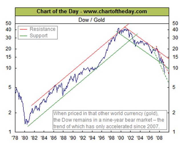 For one thing, the price of gold began to rise much faster. As I’ve said in previous commentaries, gold retains its value over centuries and millennia, To really understand the value of other assets whether it’s housing, the stock markets or currency, compare it to gold. In other words treat gold as money and see what these other assets look like compared to gold. The Dow, even though it peaked at 14,000 actually began to decline after 2001.