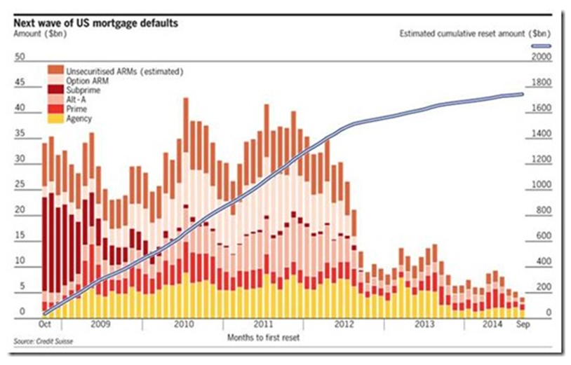 The upward sloping line is the cumulative dollar amount of mortgages being re-set (in $billions.) This graph does NOT include commercial mortgages. These will only add to the problem.