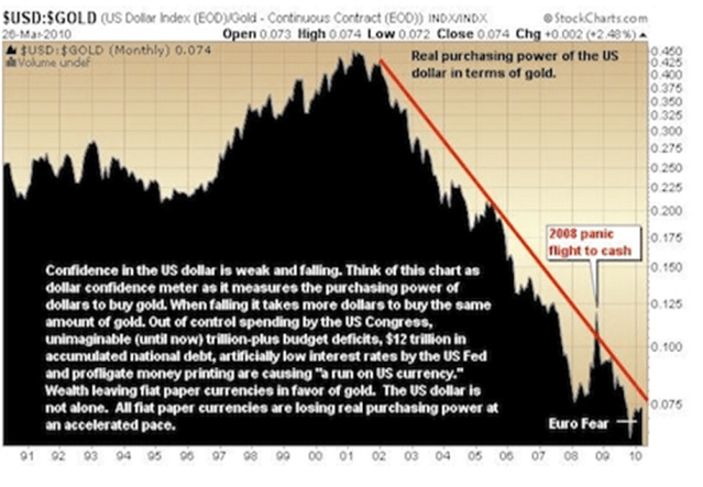 The U.S. dollar and most other currencies also began their descent in 2001. The graph below shows the U.S. dollar VS gold. Notice how the dollar slide begins after 9 – 11.