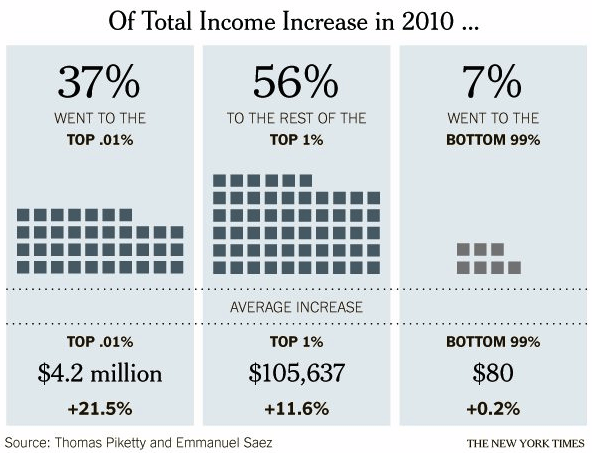 In the ultimate example of cognitive dissonance the majority of Americans scorned and ridiculed the young people being beaten, maced and arrested for protesting the rampant criminality of the Wall Street 1%ers while supporting a billionaire banker bailout, 0% interest rates that punish senior citizens and savers while encouraging further debt accumulation, and not be outraged that not one criminal banker has gone to jail. They somehow are able to observe the data in the table below and still believe that America offers equal opportunity to everyone.