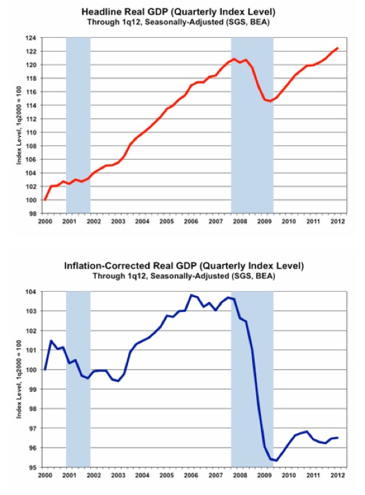 This is more than a mere academic discussion. Regular readers will recall I’ve warned repeatedly that the government’s so-called GDP “growth” numbers are very misleading because they do not include the REAL inflation rate. Here are some headlines showing GDP growth as falling but still supposedly in positive territory. Notice that The New York Times, one of the elites main cheerleaders, uses comforting words like “sustainable” to describe the so-called recovery.