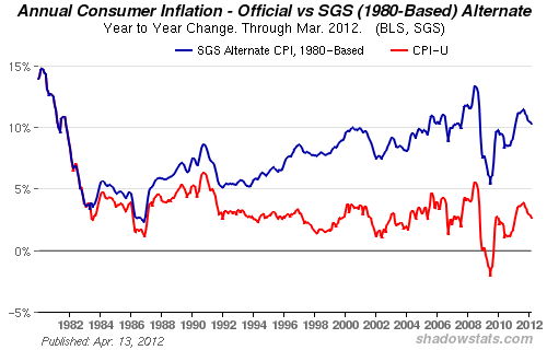 A variety of techniques are used to artificially lower the CPI. One of these is “substitution”. If the price of beef steaks goes up and threatens to raise the official CPI, they’ll substitute steak with hamburger. Their rationale is that shoppers can no longer afford steak and will buy hamburger instead. They also use the “hedonic” technique which incorporates quality changes into price. For example, if the price of a laptop this year is the same as last year but the laptop’s power has doubled, then hedonically the price of laptops has fallen 50% because the same price will buy twice the power. They use a “core” inflation calculation that does NOT include groceries or gas, ostensibly because they are volatile. How long can you survive without groceries and gas? These types of manipulation grossly understate the real rate of inflation. See the chart below