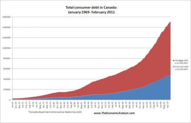 Does the debt chart below look like it’s sustainable? The red portion is mortgage debt, the blue is consumer debt. This is starting to look like Ponzi scheme and they never end well.