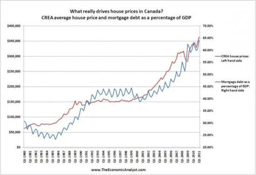 The Dollar Vigilante in Canada’s Real Estate Market – Boom Or Bust? has the graph below that demonstrates Canada’s real estate prices cannot continue forever to climb faster than GDP. The red line is house prices while the blue is mortgage debt. Both are calculated as a percentage of GDP.