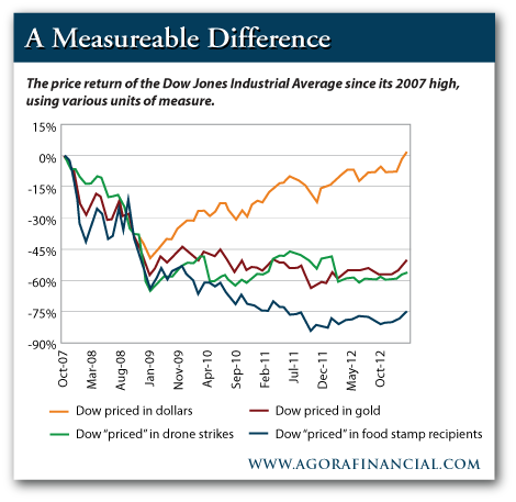 The chart above shows the DOW priced in dollars, gold and a few other interesting indicators. Compare the DOW in dollars and then to gold and you’ll see. Eric Fry sums it up like this. “Each of these metrics, in its own way, reflects a government that is “hard at work.” The fact that the Dow, priced in gold, remains very far away from a record, suggests that Chairman Bernanke is working overtime. His dollar-printing escapades have played a very big hand in the Dow’s record-setting climb. By devaluing the dollar, in other words, Bernanke “inflated” the Dow price.