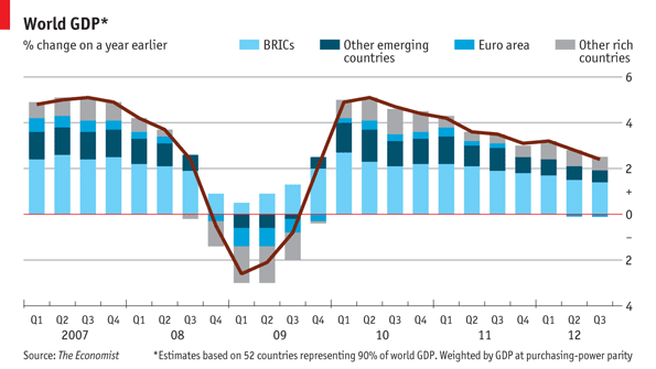 Even the Economist, one of the Elites’ mainstream cheerleaders admits, “the world’s growth continued to slow in the third quarter of last year, according to The Economist’s measure of global GDP, based on 52 countries. Global growth fell by 0.4 percentage points from the previous quarter to 2.4%, its lowest level since the end of 2009.”