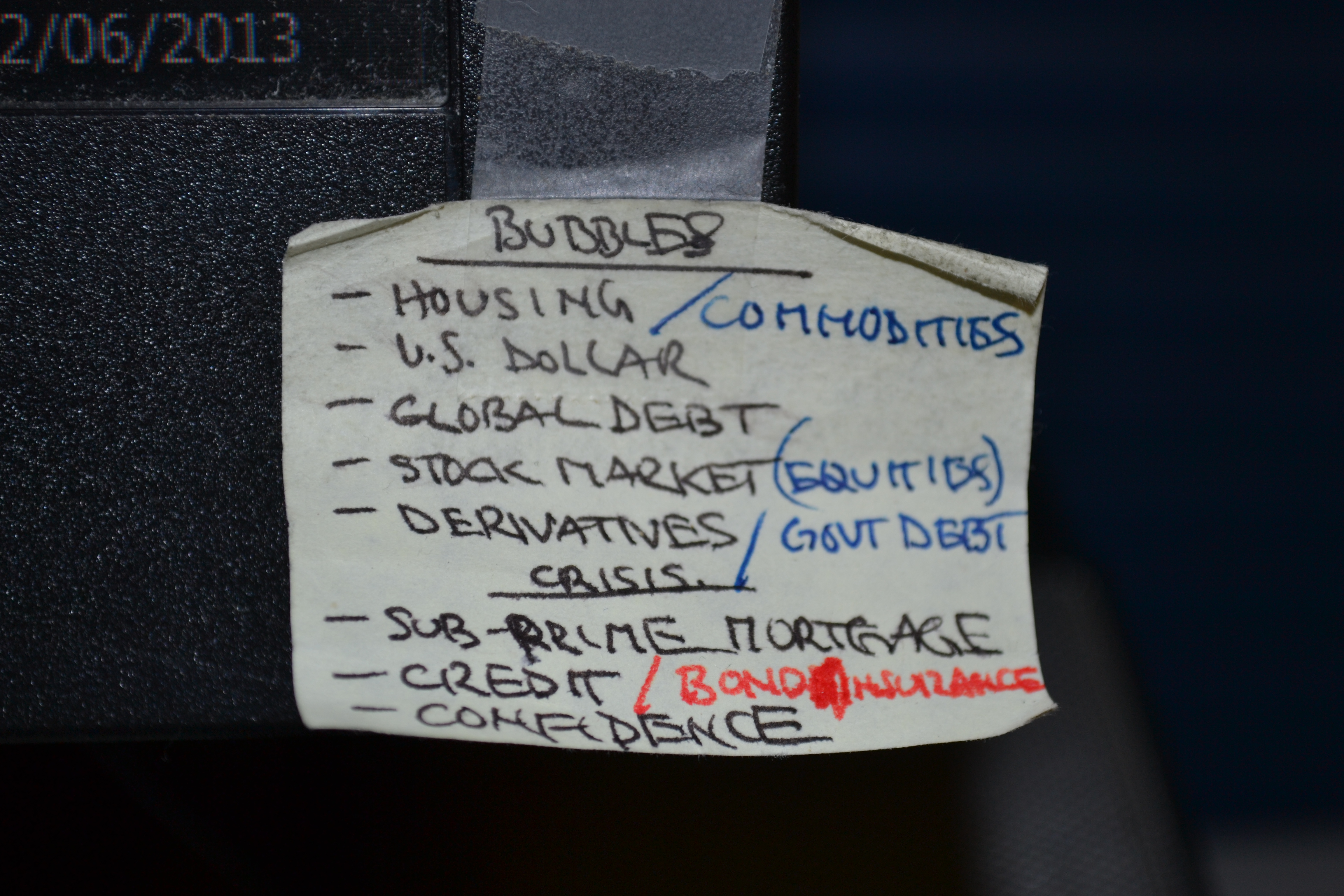 To illustrate how much global economies have deteriorated, the picture below is a Post-It note I stuck to my computer monitor in 2007. That was so long ago, the glue dried, the note fell off and I now use tape to keep it on as a reminder of where we are and how little has been fixed.