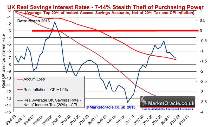 Britains’ savers and workers have continued to pay the price for over 5 years of artificially low interest rates as the Bank of England continues to print money to monetize government debt and drive down all interest rates in the economy the consequences for which is for persistently sub-inflation rates of interest that ensures that depositor cash over the coming decade will be stolen in MOST part as I warned several years ago and as iterated in the January 2010 Inflation Mega-trend Ebook (Free download), whilst the Bank of England continues to attempt to keep the general population sedated with the economic propaganda mantra of the always imminent risk of deflation something that was NEVER probable but just an excuse for the stealth theft of wealth by means of high real inflation which exists even on the governments own highly suspect official CPI measure of inflation that tends to under-report real inflation by approx 1.5% per annum.