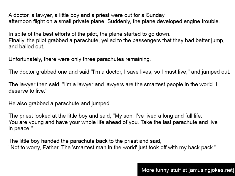 Suddenly, over the public address system, the captain announces, “Ladies and gentlemen, I am afraid I have some very bad news. Our engines have ceased functioning and we will attempt an emergency landing. Luckily, I see an uncharted island below us and we should be able to land on the beach. However, the odds are that we may never be rescued and will have to live on the island for the rest of our lives.”