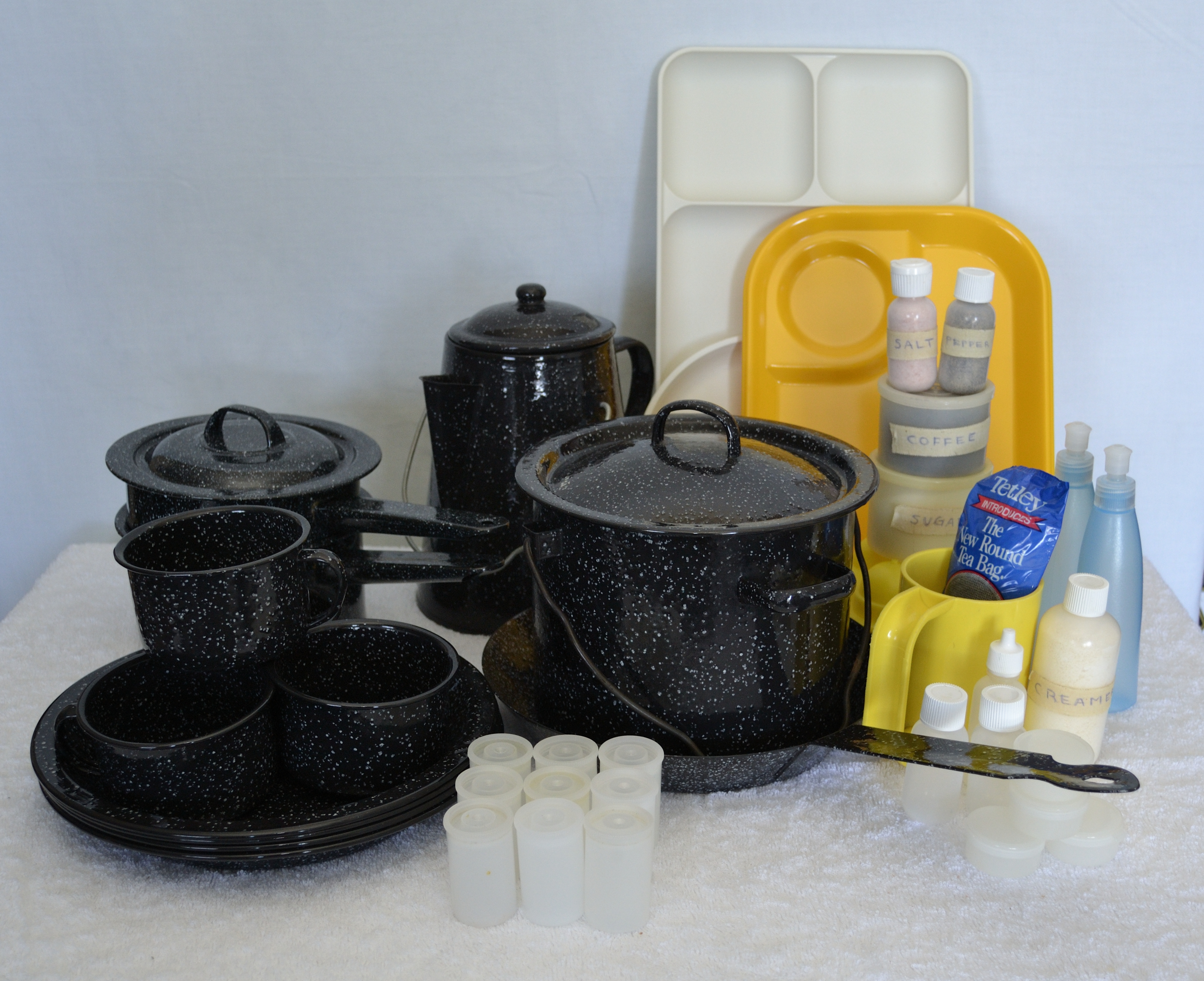 Camping pots, pans, dishware – below is vintage enamel camping ware plus more modern plastic ware and containers for various stuff. BTW – 35 MM film canisters at bottom are water proof, durable and also have 1,001 uses.