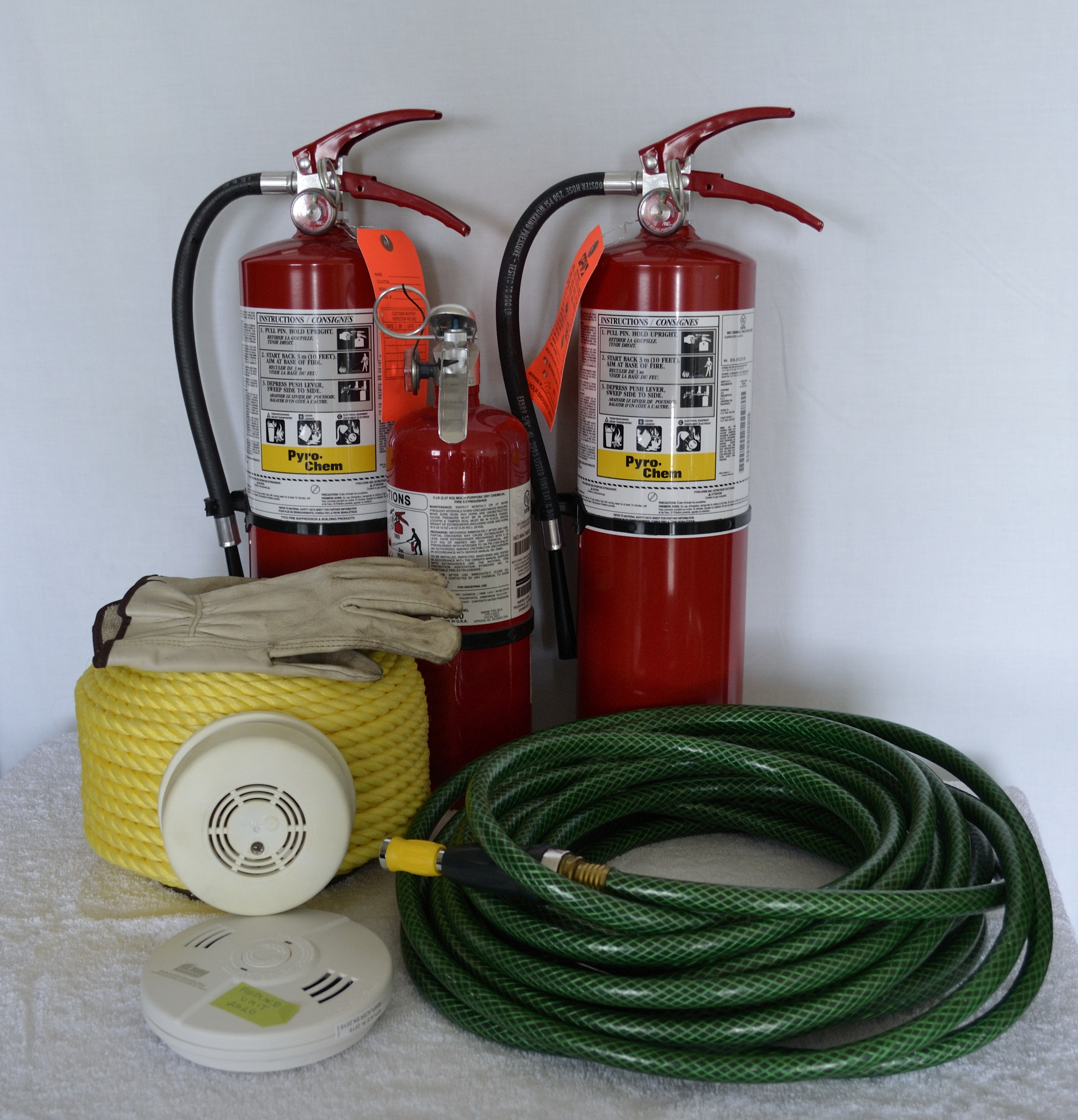 Also, in the picture below is a garden hose that has connectors for both outdoor and indoor taps as well as an adjustable nozzle. Shown below are smoke and carbon monoxide detectors. Also shown is enough rope to tie to a balcony railing and leather work gloves to assist in climbing down should that ever become necessary.