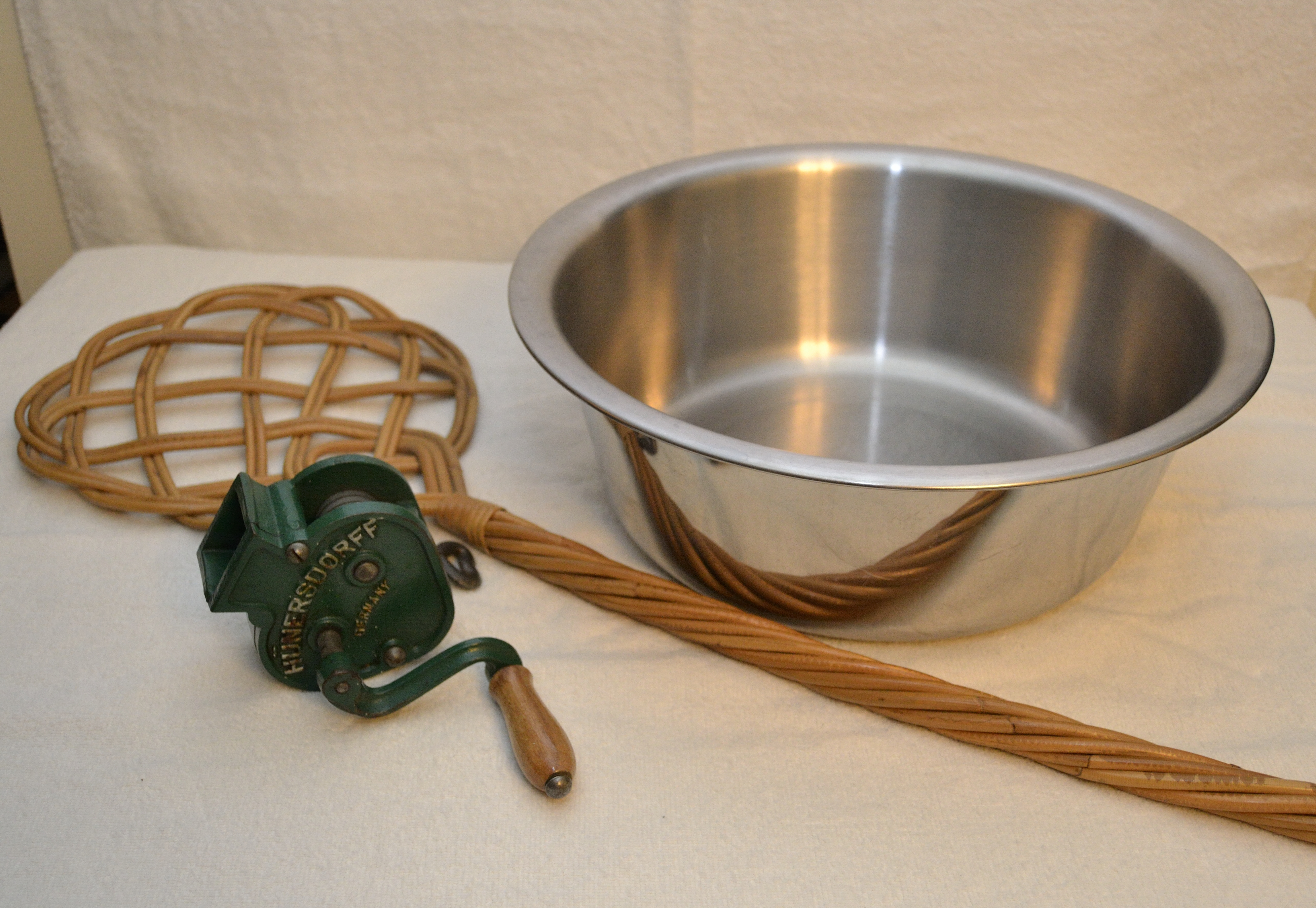 Manual tools & gear – I’ve begun acquiring old-fashioned manual gear and will begin to haunt yard and garage sales in summer looking for more. Pictured below is a vintage Hunnersdorff bean ‘frencher’, a rug-beater used to beat dirt and dust off rugs and other material that was used long before electric vacuum cleaners and a sturdy metal basin because you can’t heat water in a plastic one.