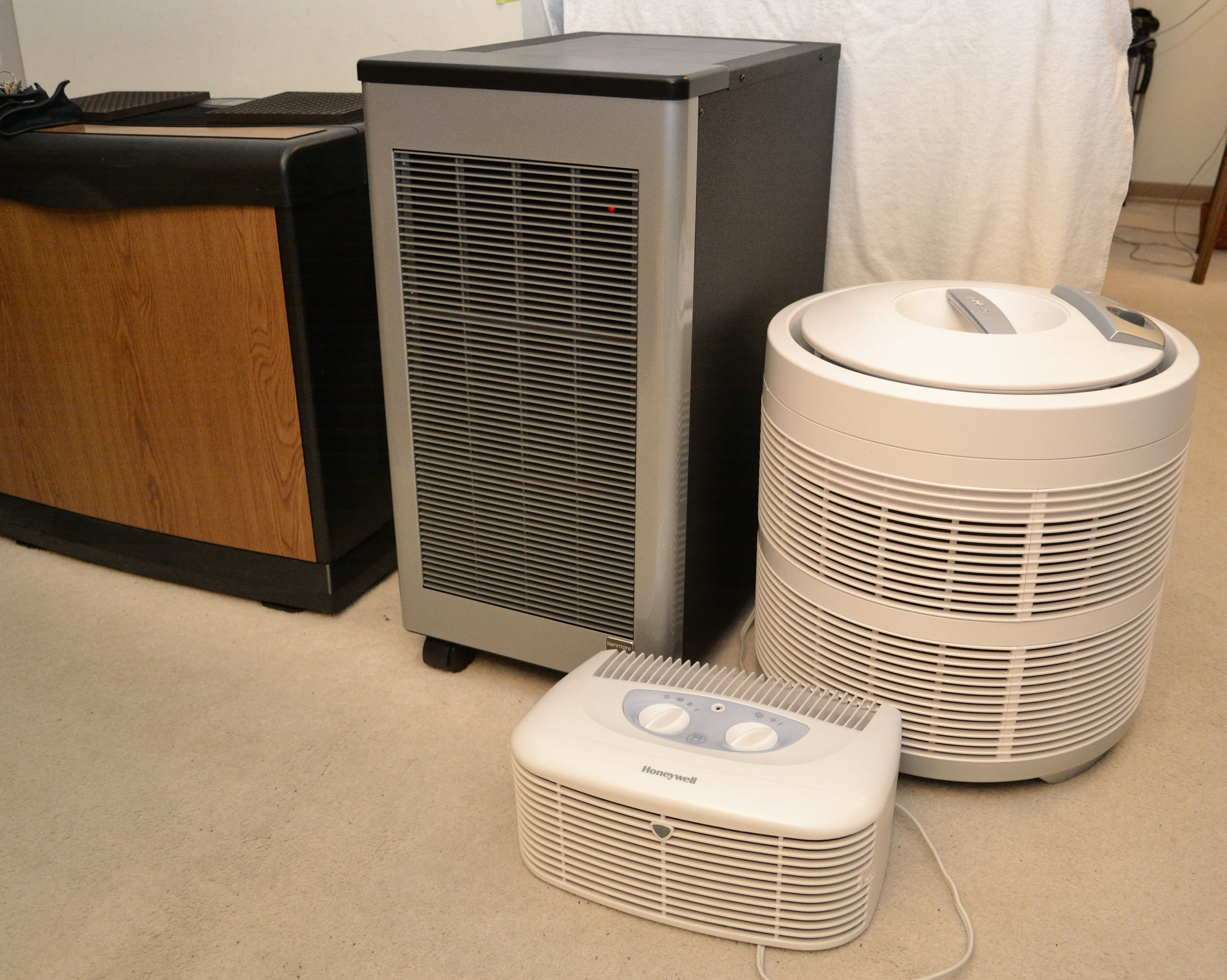 Air Purifiers – Having accumulated several thousand books over the years, I began using air purifiers because dust is the second-worst enemy of books (too much or too little humidity is the first). The large upright grey/black unit in the middle of the picture below is an electrostatic air purifier I use for the kitchen-living-dining room area. It’s rated for 864 sq. feet so it’s larger than required. This allows me to run it at medium speed during the day and slow speed at night thus conserving the life of the motor.