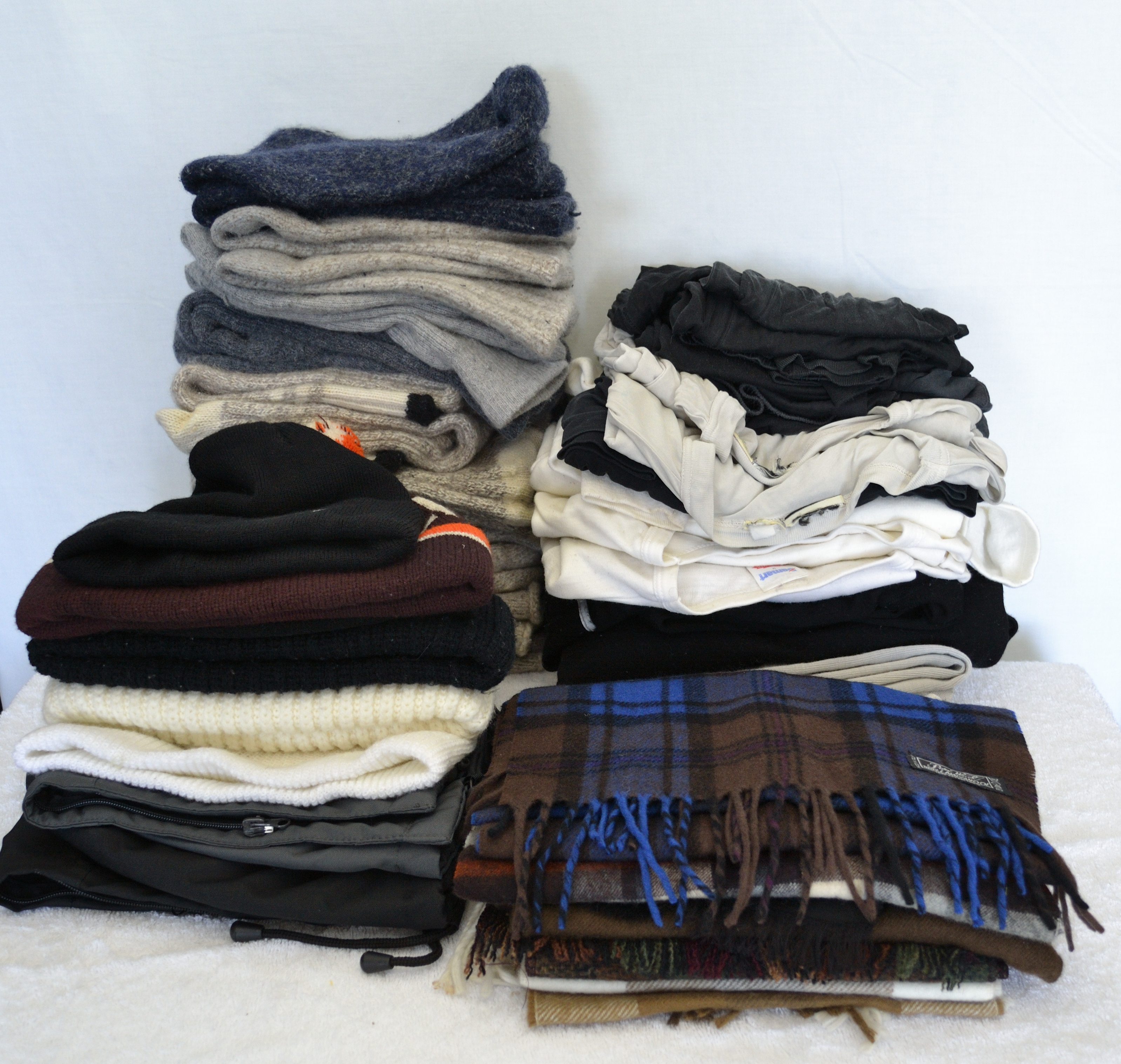 Pictured below going clockwise from upper left are wools socks. The black and white pile in the upper right is long-johns and long-sleeved undershirts consisting of silk, synthetics and wool. The technique to staying warm in winter is ‘layering’. Forget the parka ads that claim it’s the only thing you need to wear.