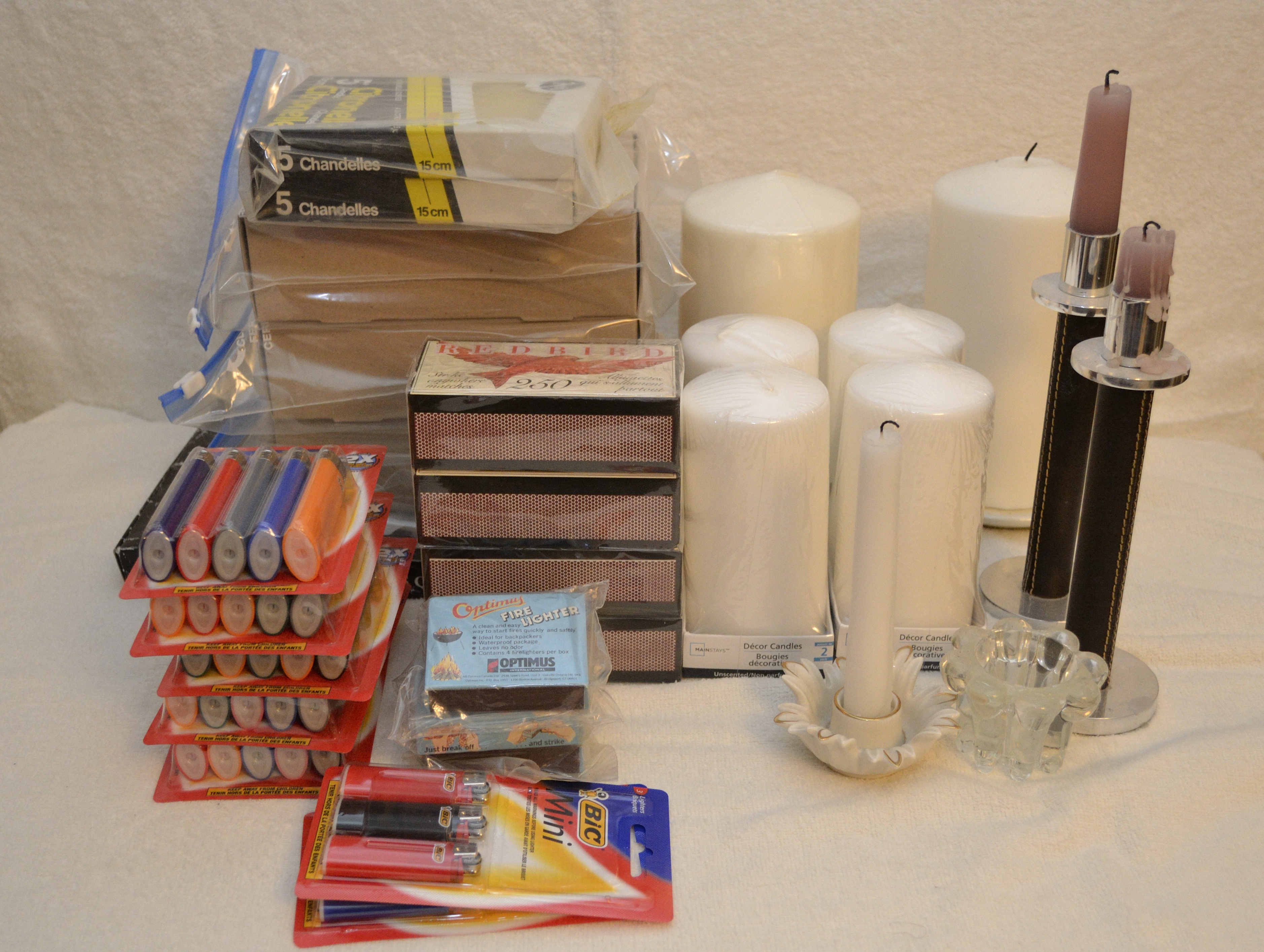 Candles, lighters, matches – When the lights go out, I have a variety of candles and stockpiles of lighters, matches and fire lighters (for the bug-out bag as they burn for several minutes).