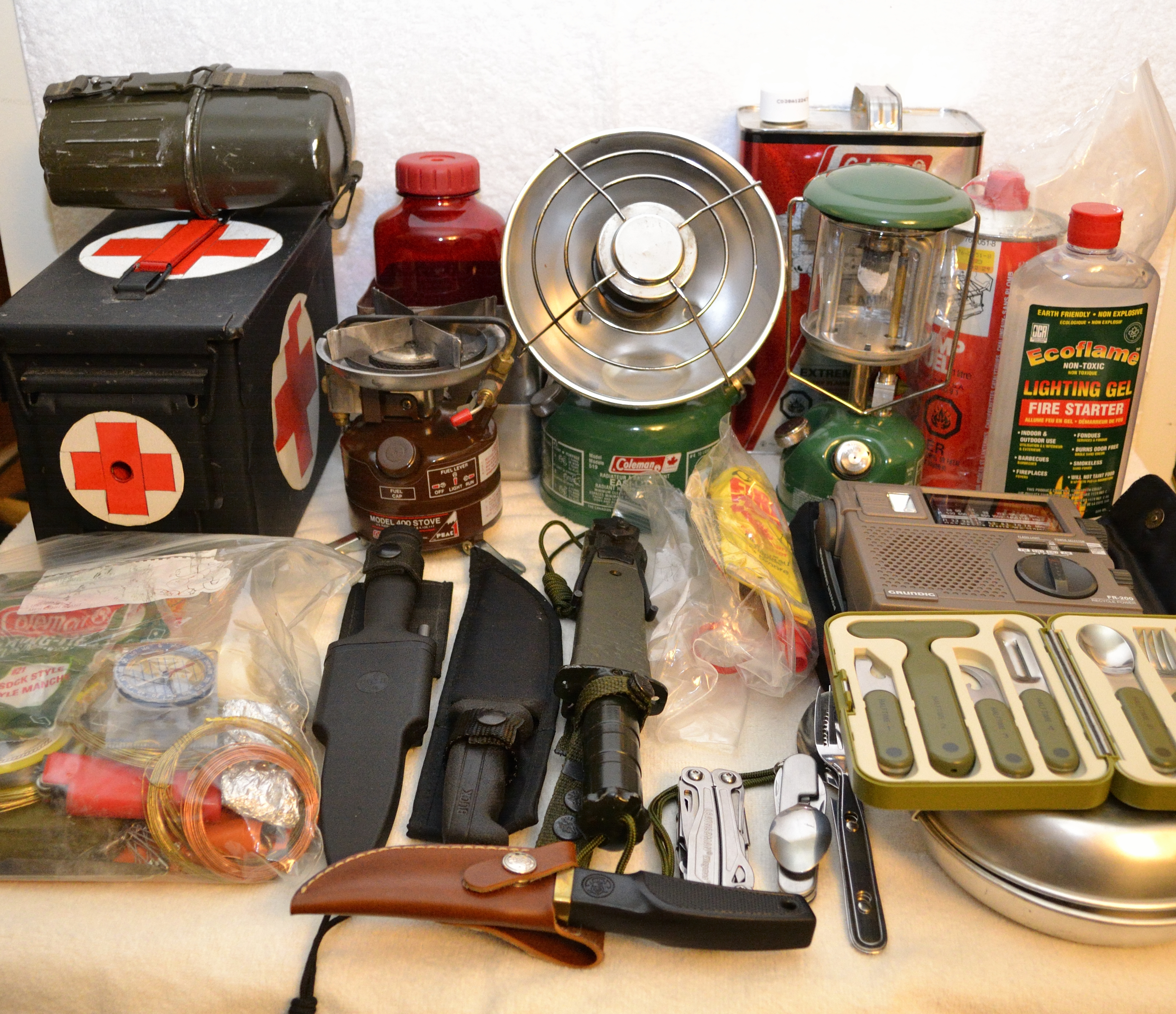 Camping & Emergency Gear – shown below is an assortment of camping and emergency gear – from upper left going clockwise is Army surplus canteen on top of First Aid supplies in an Army surplus 50 cal. ammo box, plastic water bottle behind lightweight Coleman stove, Coleman heater, fluid and lantern (always use well-ventilated because of carbon monoxide), starter fluid, Grundig portable, wind-up AM/FM shortwave radio (another AC/DC short wave radio in storage), eating utensils, metal tray, Leatherman pocket tool, assortment of knives and Ziplock bag of bug-out items such as compass, copper wire, wind-proof lighter, wax & candles, magnesium fire starter, etc.