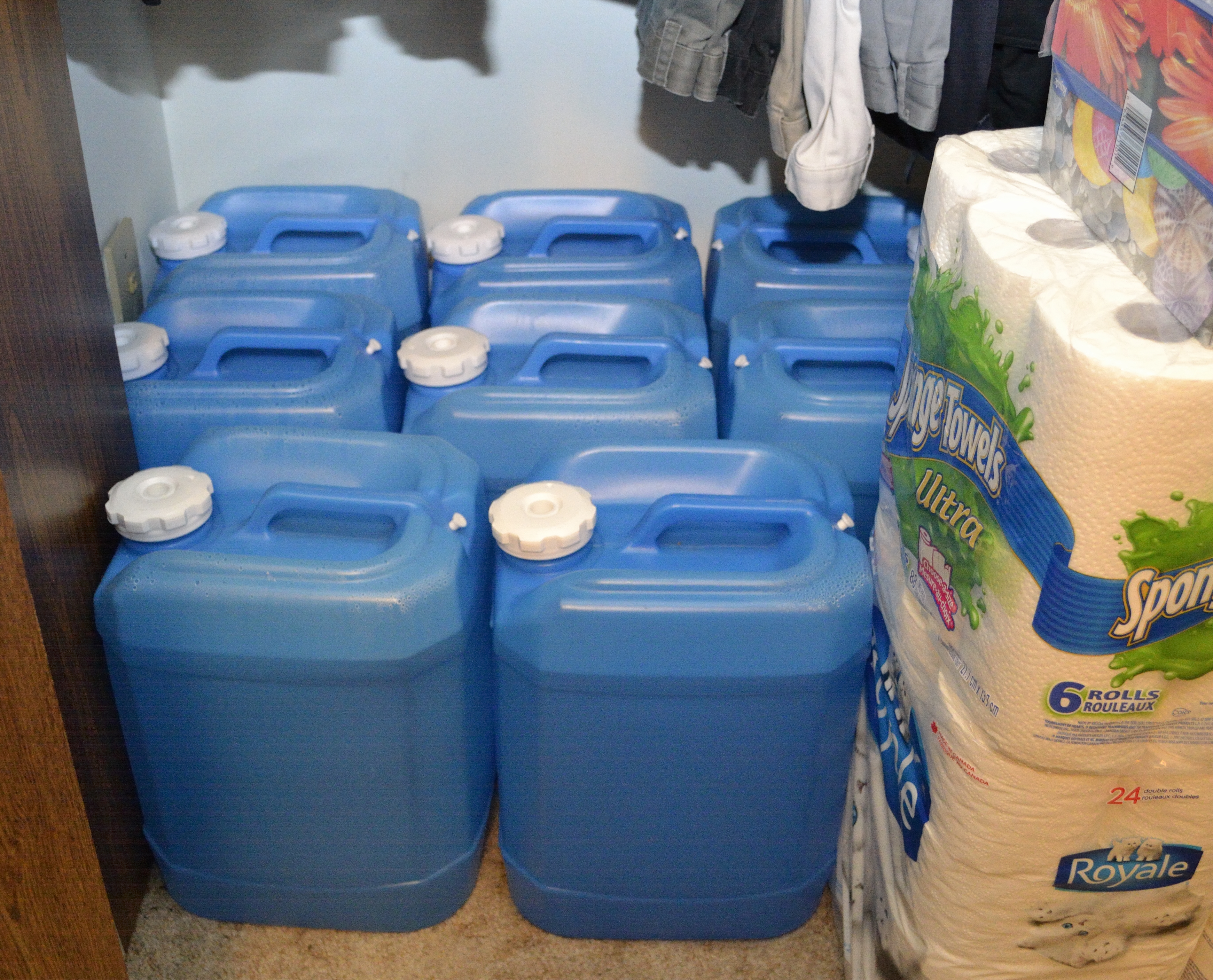 Water storage – I use eight 20 L (quart) water containers pictured below and stored in a closet. I’ve read various accounts of water needs. One liter a day is a bare minimum for drinking and 3 L/day for drinking AND cooking per person. So, 180 L would last one person 60 days at a bare minimum but nothing for washing or toilet flushing.