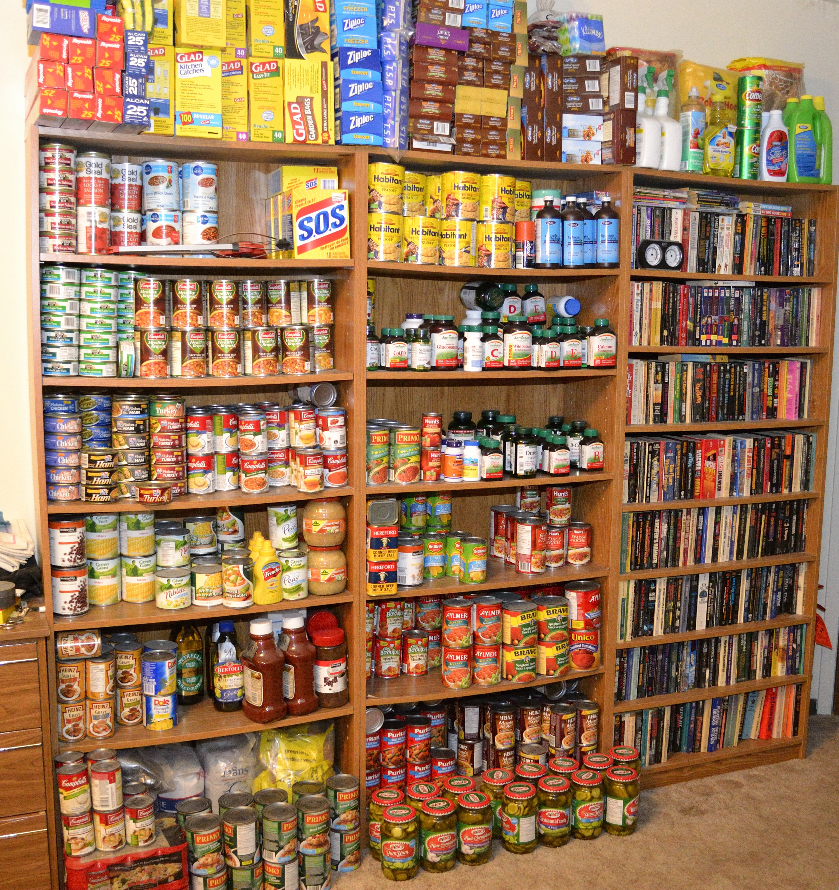 The picture above shows some of the bookshelves I bought on sale that I use as a pantry for food, vitamins, cleaning supplies, tin foil, garbage bags, etc. in addition to the kitchen pantry. Being open shelves, it’s easy to see what’s in short supply and needs to be replenished and rotated (oldest at the front, newest at the back).