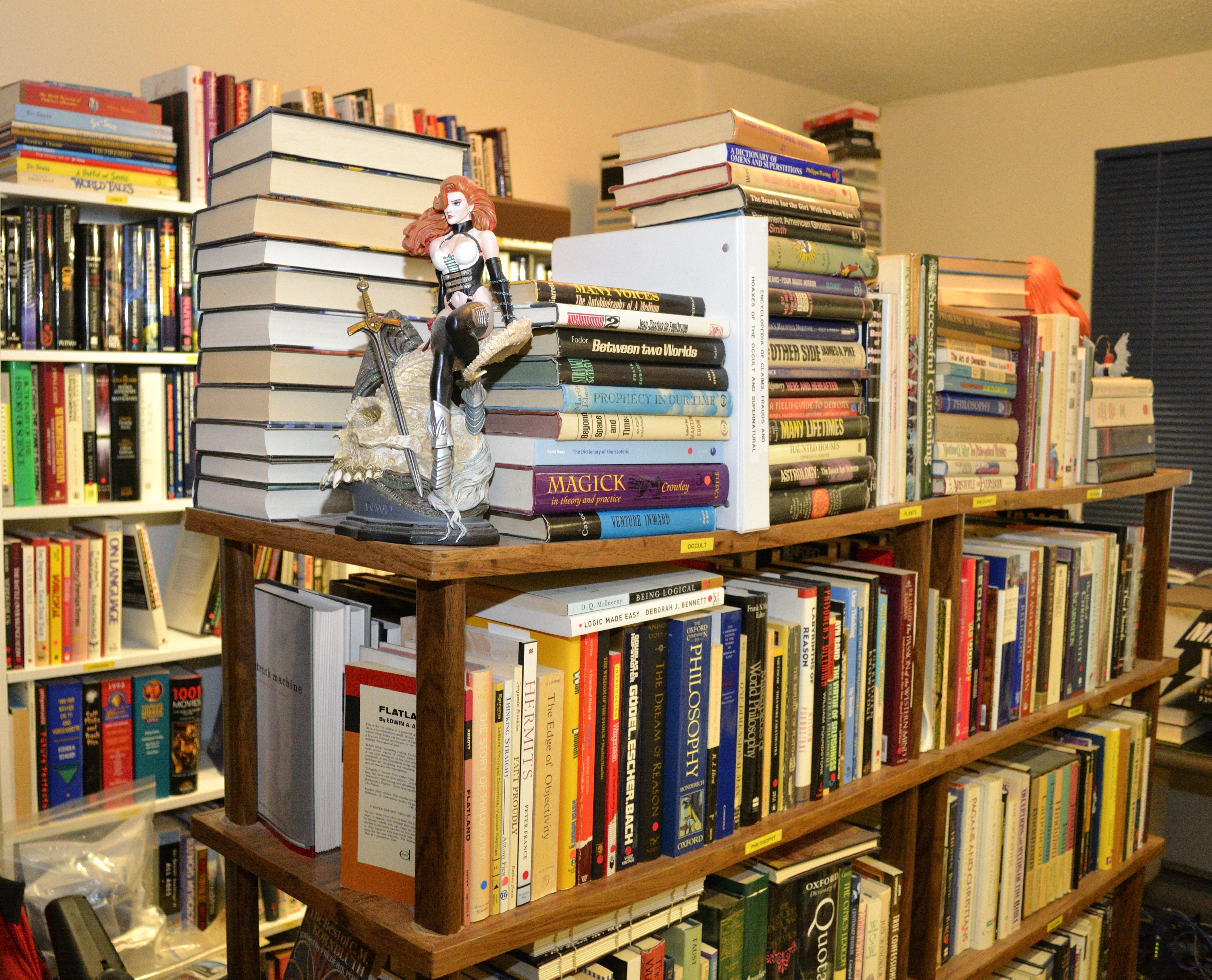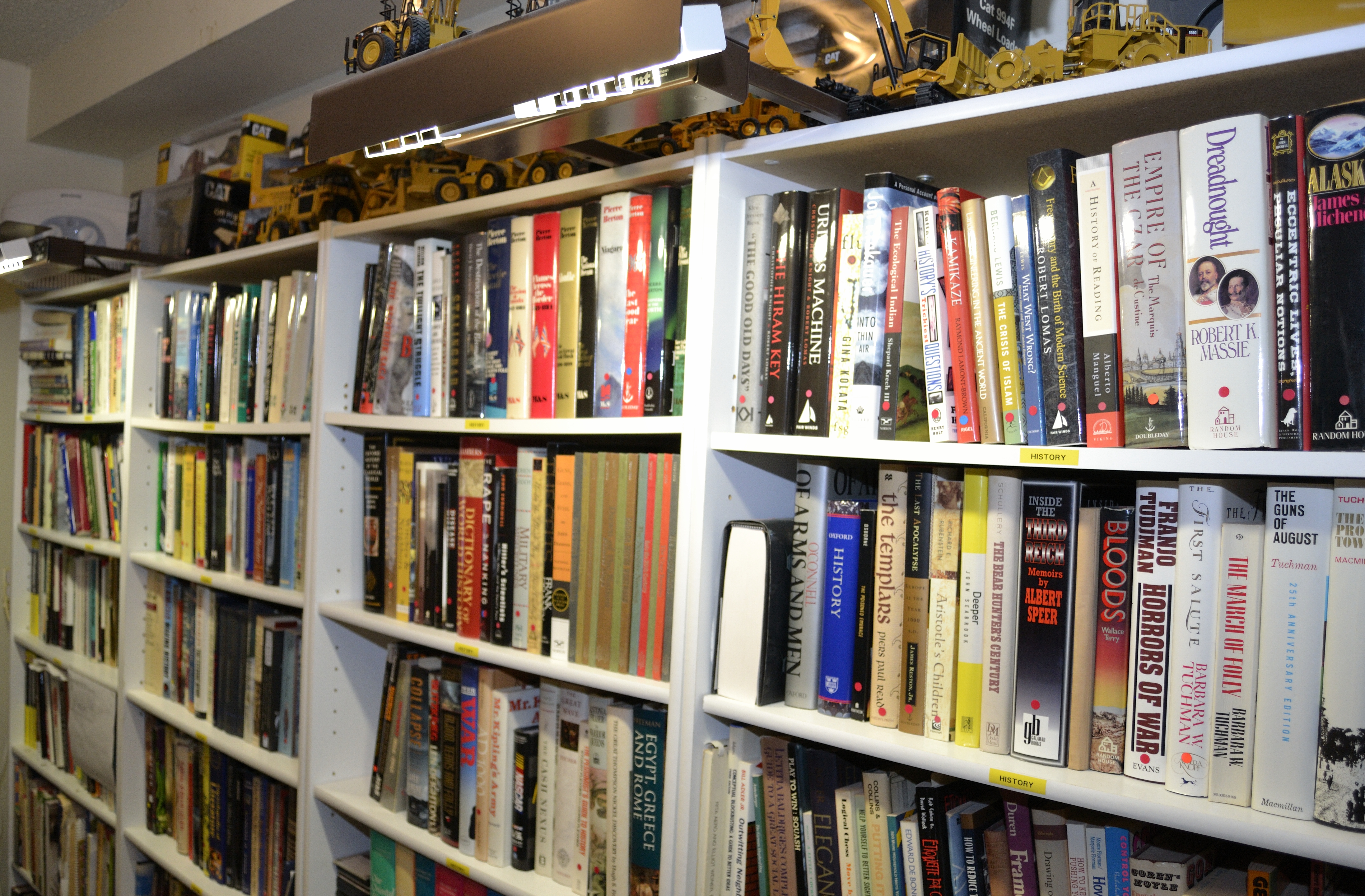 Books – we bibliophiles believe we can never have enough books. Modern gadget-heads may scoff at these ‘dead trees’ but with the aid of sunlight, candles, lanterns or flashlights you can read a book long after the electricity is off and the internet is down. I was given my first book, the Holy Bible, in 1957 but serious additions to my library didn’t start until I was a teenager in the 1960’s. Pictured below are several of many books shelves. I use small red sticky dots to identify books I haven’t read yet.