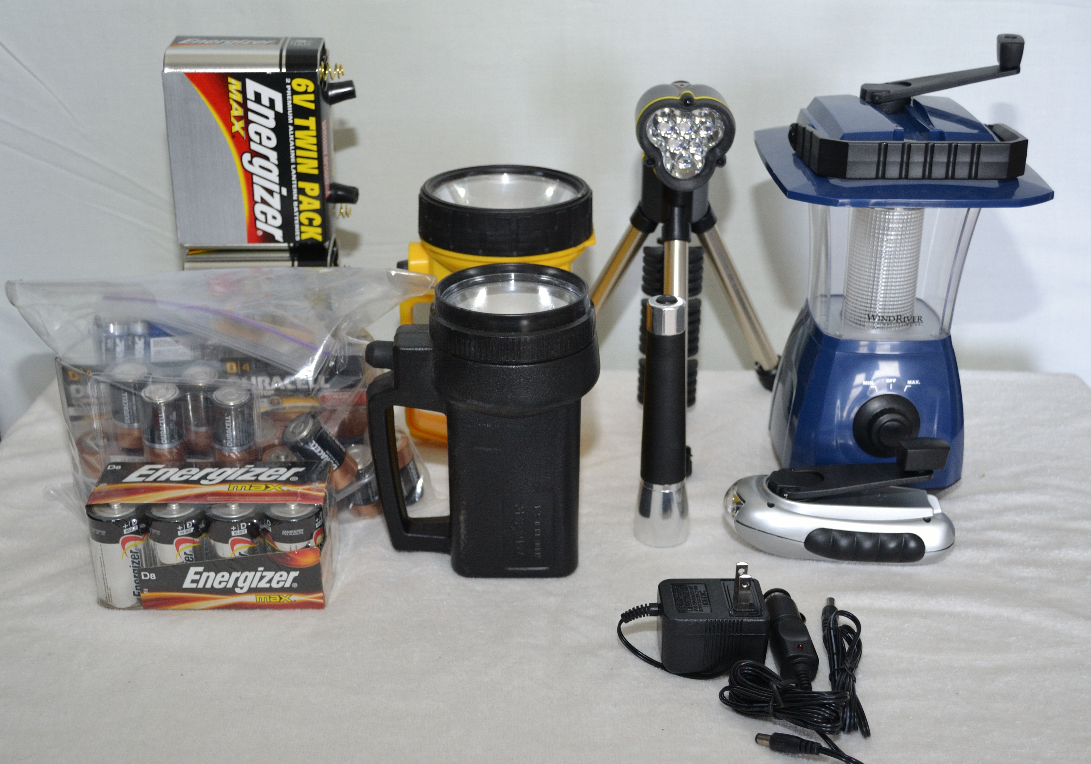 Flashlights & batteries – pictured below are an assortment of flashlights – both battery-powered as well as hand-cranked. Make sure you have lots of spare batteries because hand-cranking is a pain, not very efficient, you’re muscles give out before long even when taking turns with others.