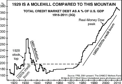 The chart below shows that today’s mountainous debt level makes the debt prior to the last Great Depression look like a molehill. The debt/credit excesses of the 1920’s led up to the stock market Crash of 1929 and the Great Depression that followed. Can there be any doubt where today’s enormous debt level is leading?