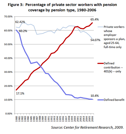 One of many reasons so few Boomers are unwilling and unprepared for retirement is the decline in defined benefit pension plans and the increase in defined contribution plans. In 1980, 60% of workers had defined benefit plans whereas today it’s fallen to 10% while the number of defined contribution plans (individual responsibility) has increased from less than 20% to well over 60% as shown in the graph below.