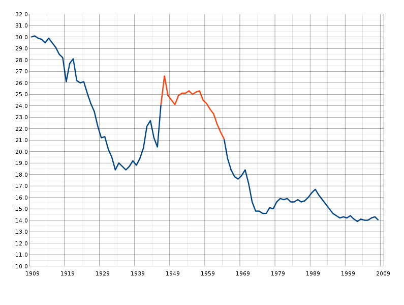 There is much demographic tragedy on the left side of that chart. The high birth-rate in the early part of the 20th Century is due to high infant mortality. Families had many children because most weren’t expected to survive their early years. Also, the rapidly declining birth-rate after the First World War 1914 – 1918 comes from the unmarried “surplus women”