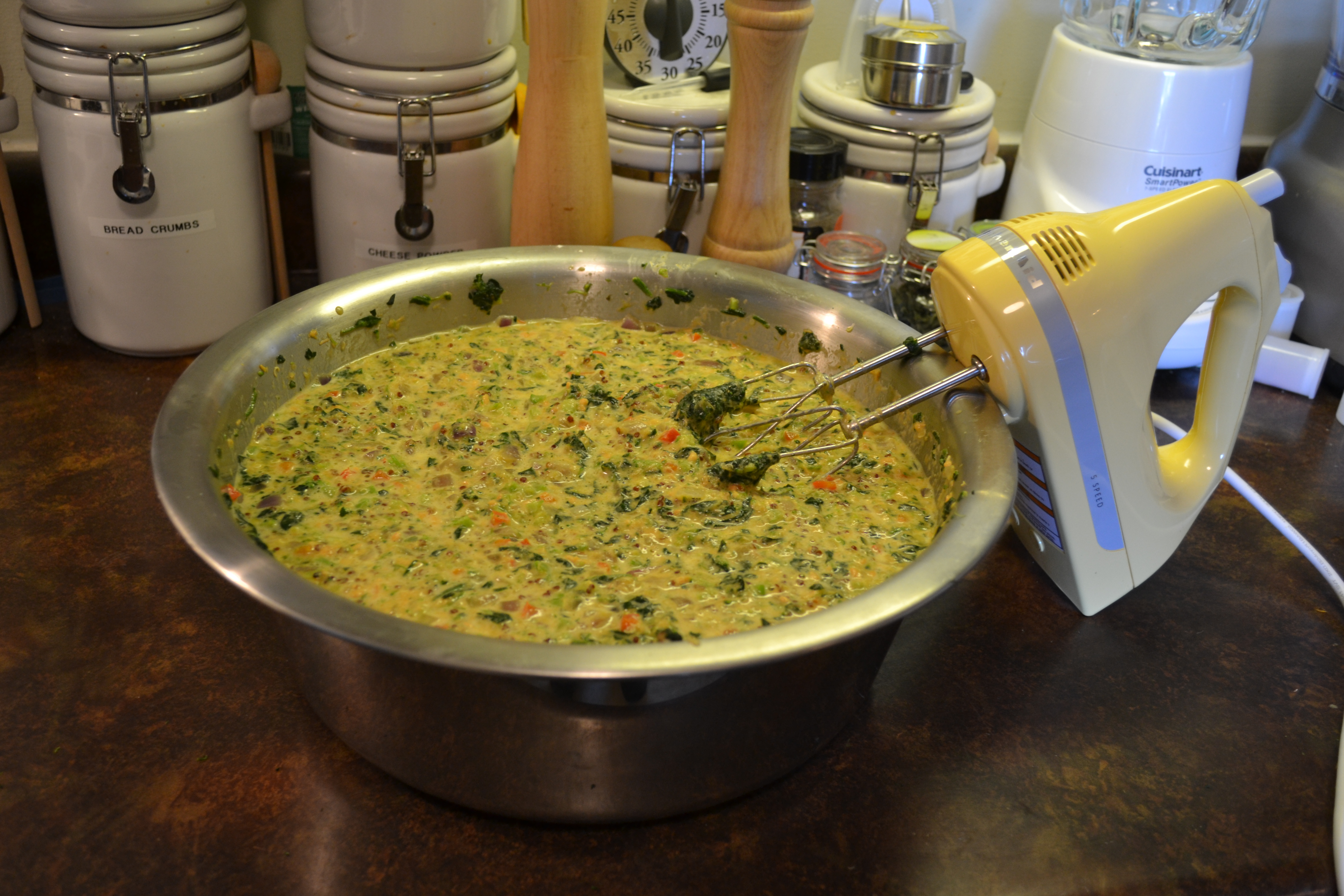 In a large bowl whisk or beat eggs then add milk, salt, pepper & spices.