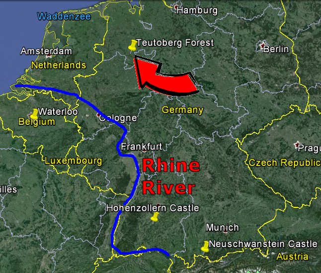 The modern day map below shows the location of the Teutoburg Forest in present-day Germany.